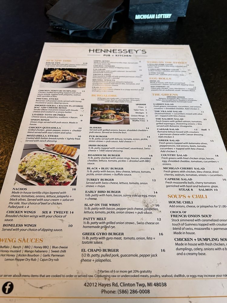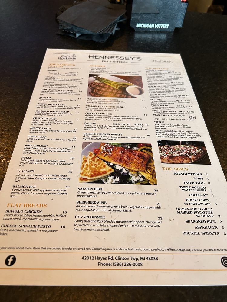 Welcome to Hennessey's Pub + Kitchen, a lively gem located at 42012 Hayes Rd, Clinton Twp, MI, where casual dining meets flavorful delights. This upscale bar specializes in a tantalizing variety of burgers and salads, along with a mouthwatering selection of sandwiches like the Cubano and Philly Steak Cheese. The menu also boasts hearty sides, including seasoned fries and homemade garlic mashed potatoes, perfect for satisfying your cravings.